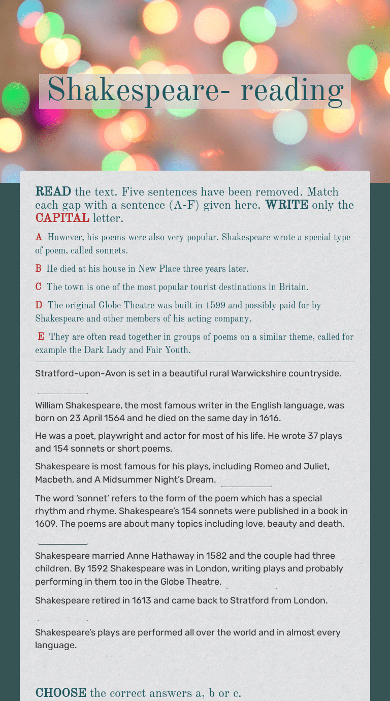 Get your students to understand, appreciate, and yes, even love shakespeare . Is a passage from shakespeare's play "as you like it." read the passage and pay special attention to the underlined words. English as a second language (esl) . Explore more than 10000 'shakespeare language' resources for teachers, parents and pupils as well as related. The language of shakespeare worksheet.